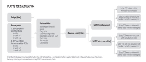 S&P Global Platts is the commodity arm of the parent company S&P Global. Platts is a provider of energy and commodities information and is the primary source of benchmark price assessments in the physical commodity markets along with in-depth analytics. For over 100 years Platts has brought clarity and transparency to the commodities markets. Platts Bunker Charges (PCBs) provide the container market with better tools for managing exposure to volatility and bunker prices and container freight by providing independent indexes. PCBs are fully independent and transparent tools negotiating bunker charges in container freight, leveling the playing field for shippers, carriers, and logistics providers by acting as a replacement for the current Bunker Adjustment Factor (BAF) system, alongside additional Low Sulphur Surcharge (LSS) and Marine Fuel Recovery (MFR). The issue with BAFs across global container market is lack of standardization and transparency in the underlying formulas. Shippers and logistics companies face a multitude of indications and formulas with quotes for the same routes, sometimes the quotes are vastly different with little to no apparent explanation. The ports chosen, length of review period for bunker prices, fuels used as a reference and capacity utilization may vary significantly. There can also be emergency and low sulfur surcharges (EFS) added to the BAFs, all being on top of the general freight element. In contrast, PCBs allow industry players to factor fuel costs into freight contracts easily. Providing daily transparent updates, allows for a robust means of tracking fuel cost fluctuations. PCB calculations are broken down to reflect the actual use of each fuel, depending on distances traveled, by feeding daily Platts bunker prices including 0.5% marine fuels and marine gasoil into transparent bunker charge formulas. Th final product is a daily $/FEU bunker charge number for each of the key trade lanes, both headhaul and backhaul, based on standardized and transparent formulas which are visible to all associated parties. Platts Time Charter Equivalent (TCE) assessments for tanker freight reflect the net daily revenue of vessels operating on key dirty tanker routes in the European shipping market. TCE's provide daily assessments expressed in $/day. They provide dual TCEs reflecting scrubber and non-scrubber tonnage. They reflect bunkering patterns by publishing three assessments for each TCE (using daily bunker costs; based on bunker costs one week prior; and based on bunker costs two weeks prior).