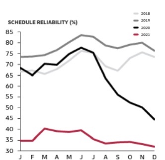 Ocean reliability reached its lowest in December 21, declining from 33.2% in November down to 32.0% in December. It dropped to the lowest ever recorded by Sea-intelligence since the start of measuring in 2011.
