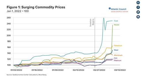 The market has been very volatile since the March 8 ban on oil that has impacted commodities, surging their prices significantly, especially when you look at metals. The chart below provides a visual into the surge of commodity prices. Nickel has increased dramatically, which impacts the price of steel as well since nickel is a key alloy used in mills. Russia exports 28% of the world's raw nickel and while Australia accounts for 15% and Canada 11%, there are no practical alternatives to Russia in the global marketplace for nickel, explaining the dramatic increase in price over the last two weeks. Due to the large percentage of export Russia has, these prices may remain high for some time. Any increase in iron prices may be short lived because Russia overall only exports 5.2% and the Ukraine only 2.3% of global share in iron and steel. Other global players may be able to replace both nations export market and so medium to long-run these prices may recover.